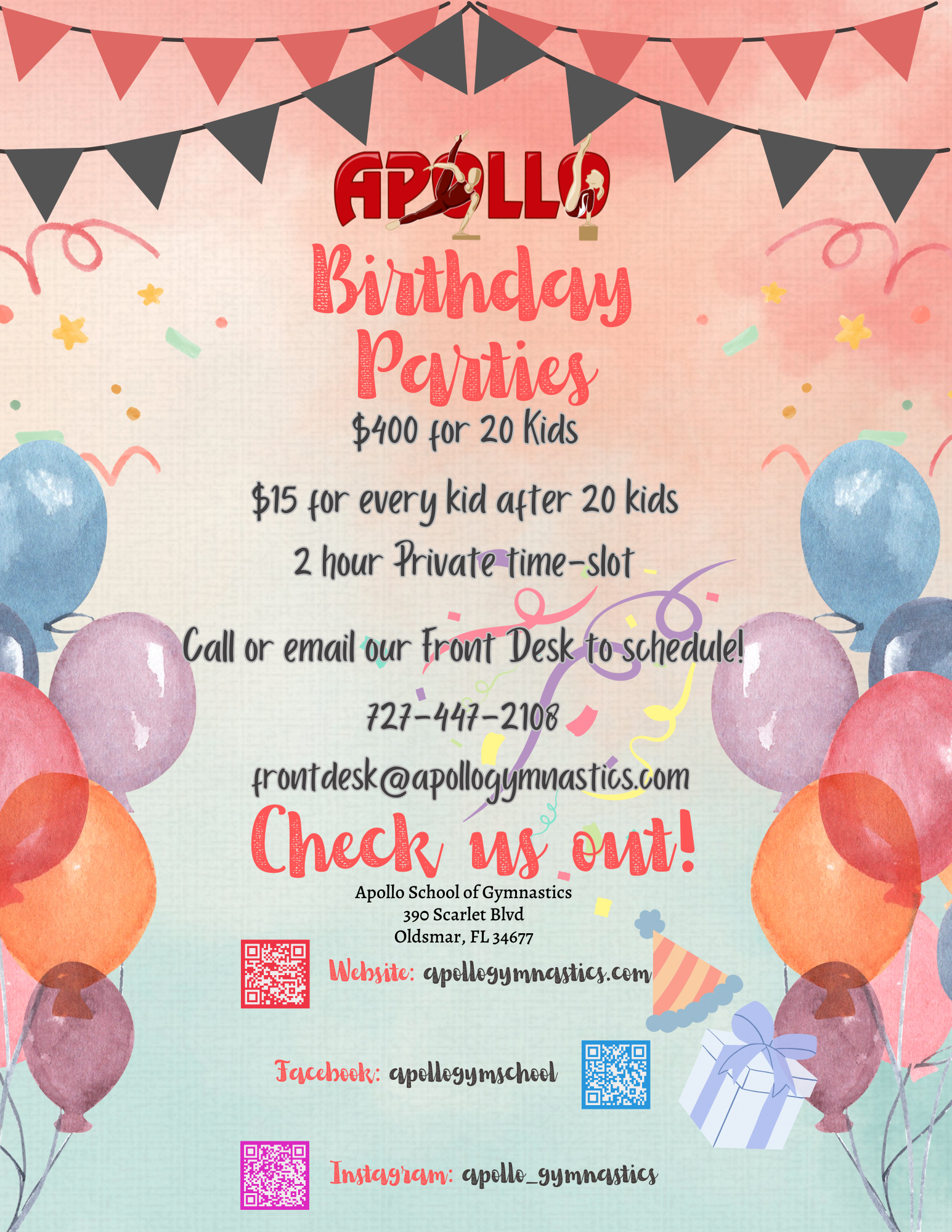 Two party packages to choose from. Complete use of the gymnasium for the scheduled time with Activities appropriate to the age of the person for whom the party is being held.
